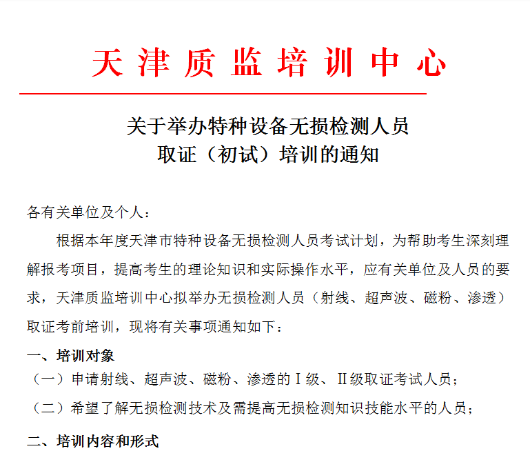 关于举办特种设备无损检测人员取证(初试)培训的通知